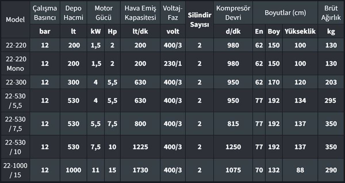 Düşük basınç pistonlu tip kompresörler, güvenirlilikleri ve performansları ile en hassas uygulamalarınız için en doğru seçimdir. En iyi fiyat-performans avantajı, minimum bakım gerekliliği, optimum verimlilik gibi özellikleri ile uzun yıllar boyunca endüstriyel basınçlı hava ihtiyaçlarınıza cevap verirler.